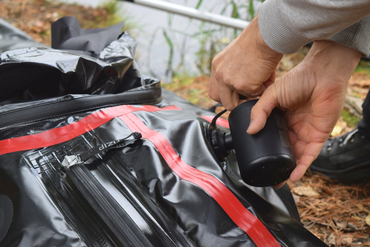 En riktigt kompakt och snabb batteridriven pump för Packraft! Med denna lilla pump, ungefär lika stor som en läskburk, kan du enkelt och snabbt fylla på din packraft flera gånger på en enda laddning. Det tar bara 1-2 minuter att fylla din packraft med denna pump!