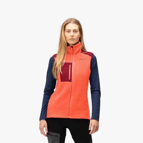 Norrøna Trollveggen Thermal Pro Vest W's är Norrønas varmaste, mest hållbara fleeceväst för damer, som är framtagen för bergsklättring men fungerar lika bra för allmänt friluftsbruk när temperaturen sjunker. Västen tillverkas av Polartec® Thermal Pro® med unik stickteknik, som skapar luftfickor för att fånga luft och bibehålla kroppsvärmen, och som har ett utmärkt förhållande mellan värme och vikt. Materialet är bekvämt och har utmärkt ventilation, och är snabbtorkande, mycket hållbart och motståndskraftigt mot noppor. Västen har även två handvärmarfickor, en bröstficka, en varm och väderskyddande krage, och en normal passform med något längre baksida för extra skydd.
